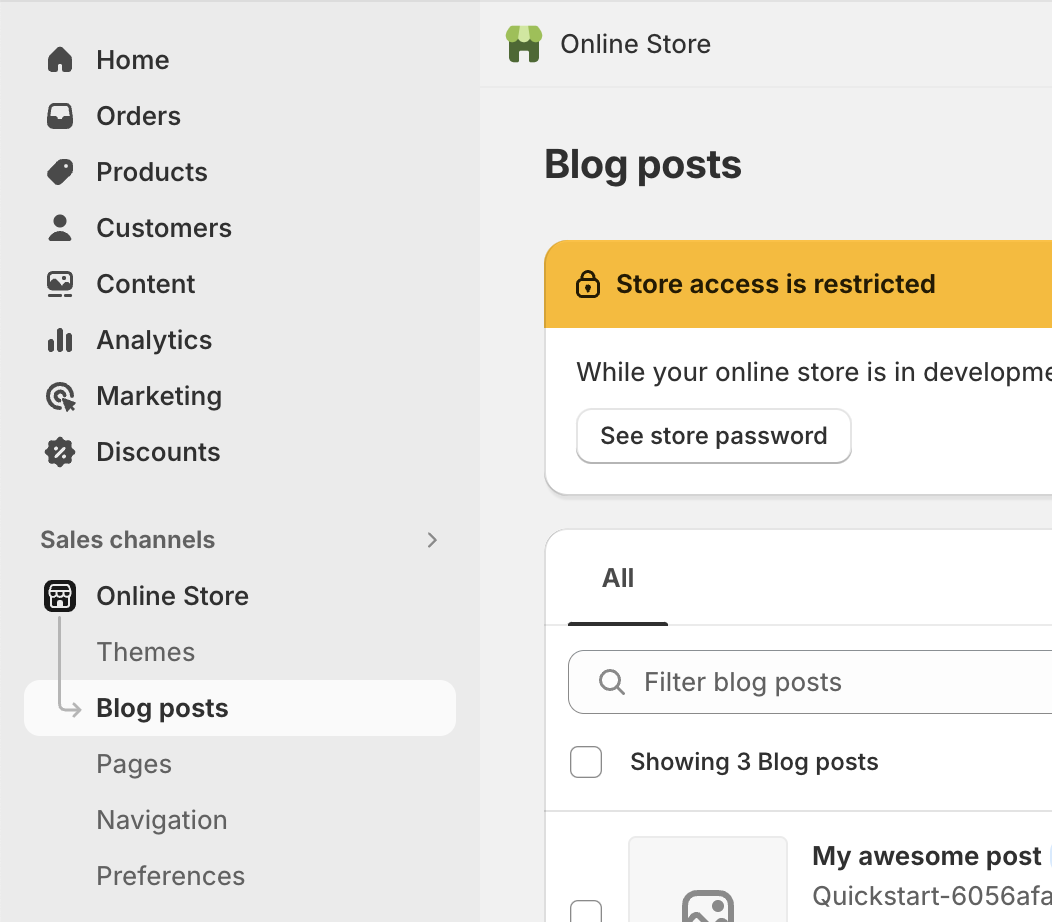 To begin creating content, you can use the Shopify blog section included with your online store. You can find this under the "online store" section in the left sidebar.